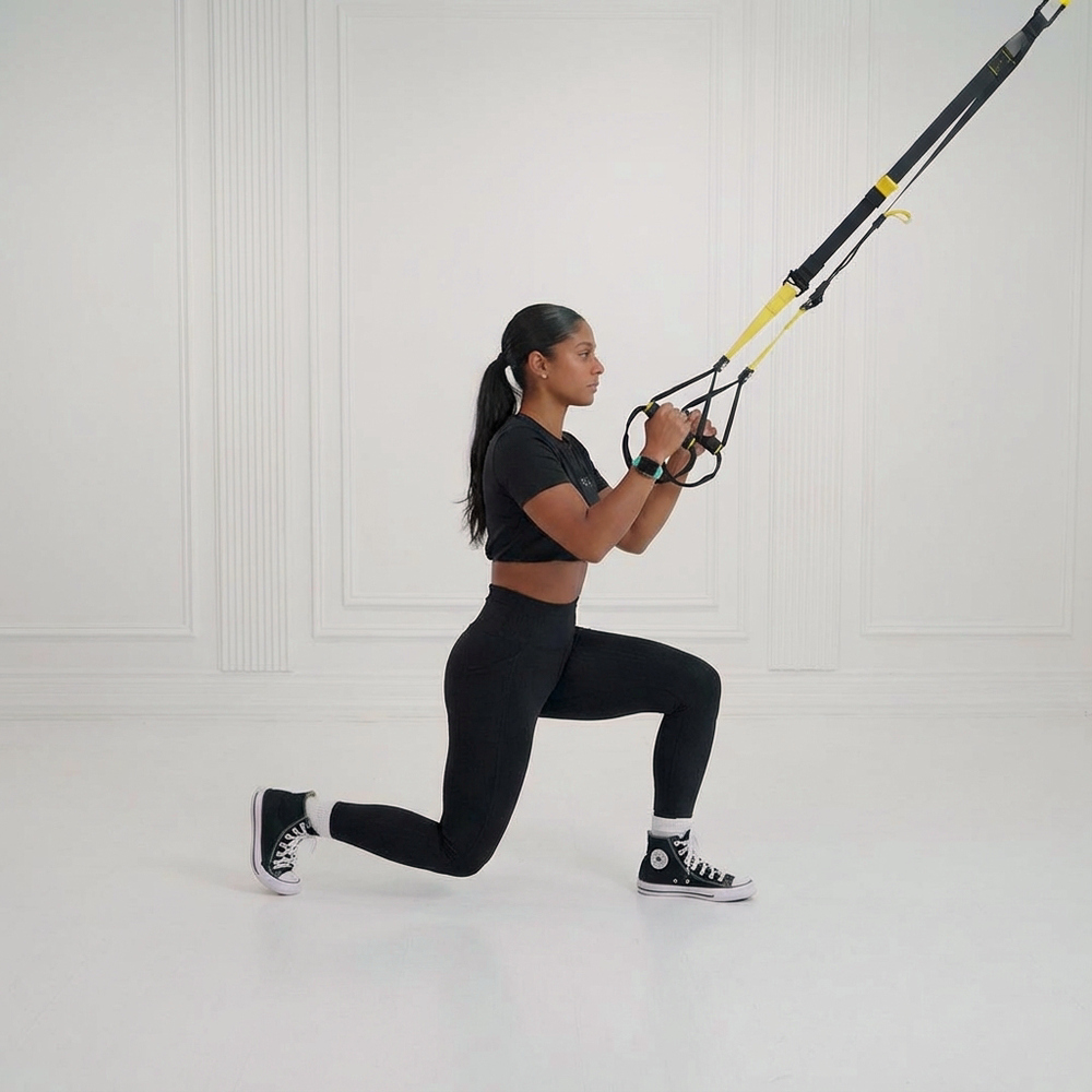 TRX-assisted forward lunge with chest stretch that targets quads and glutes for lower body strength while opening the chest to improve balance, hip flexibility, and posture.