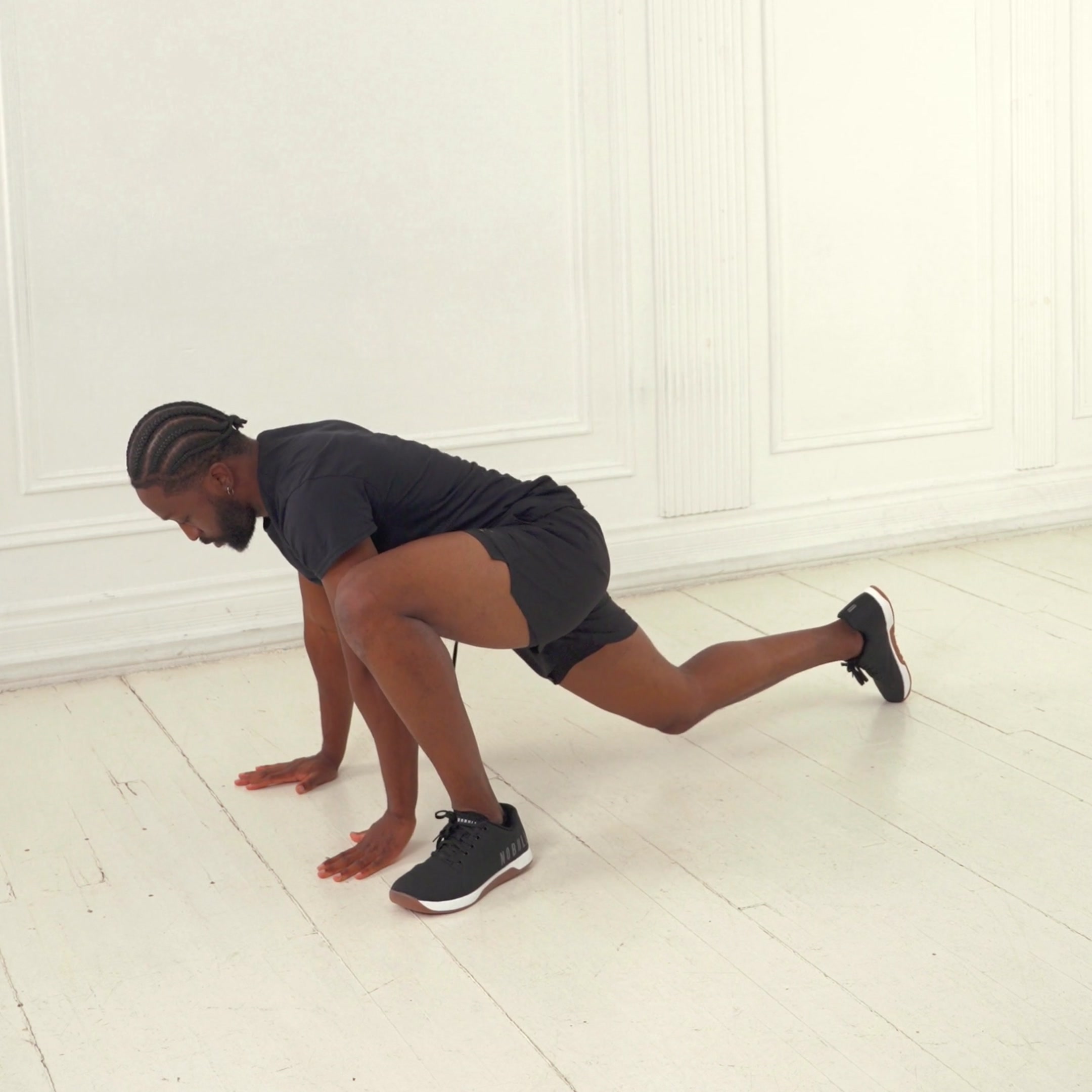 Lower until chest nears floor and upper arms parallel to ground; drive knee to elbow height without rotating hips.
