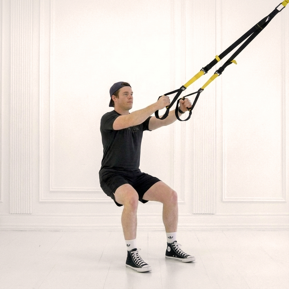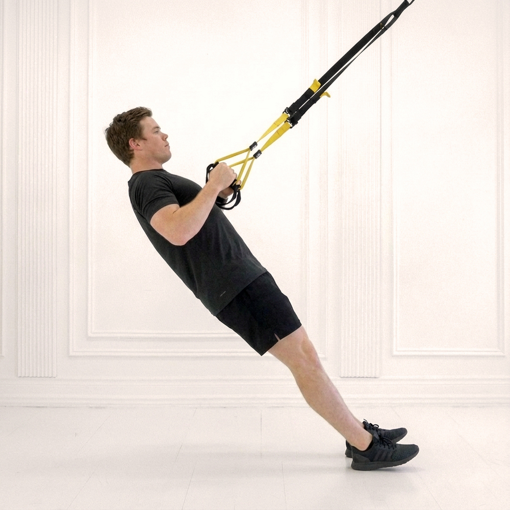 Anchor TRX at chest height. Grasp one handle with neutral grip, step back to extend arms, feet shoulder-width, body plank-straight from head to heels.