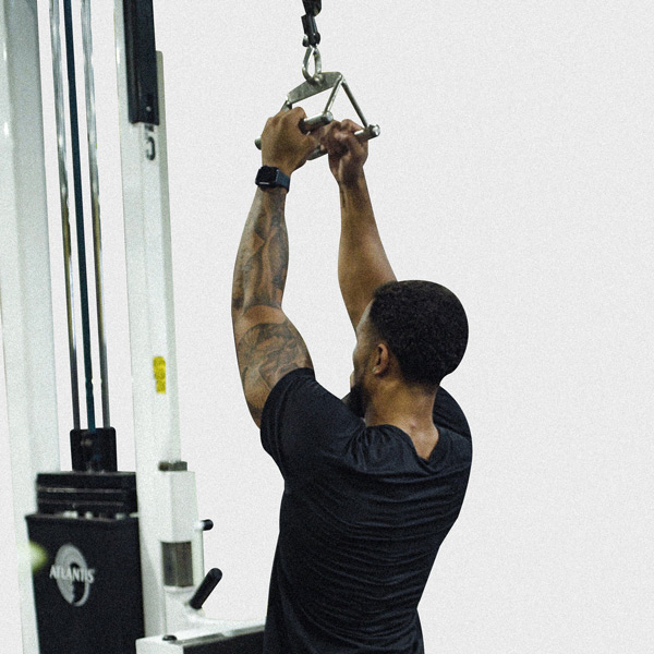 Extend arms fully until straight with a slight forward lean; pull until V-bar reaches lower abdomen and elbows are behind torso, keeping torso stationary.
