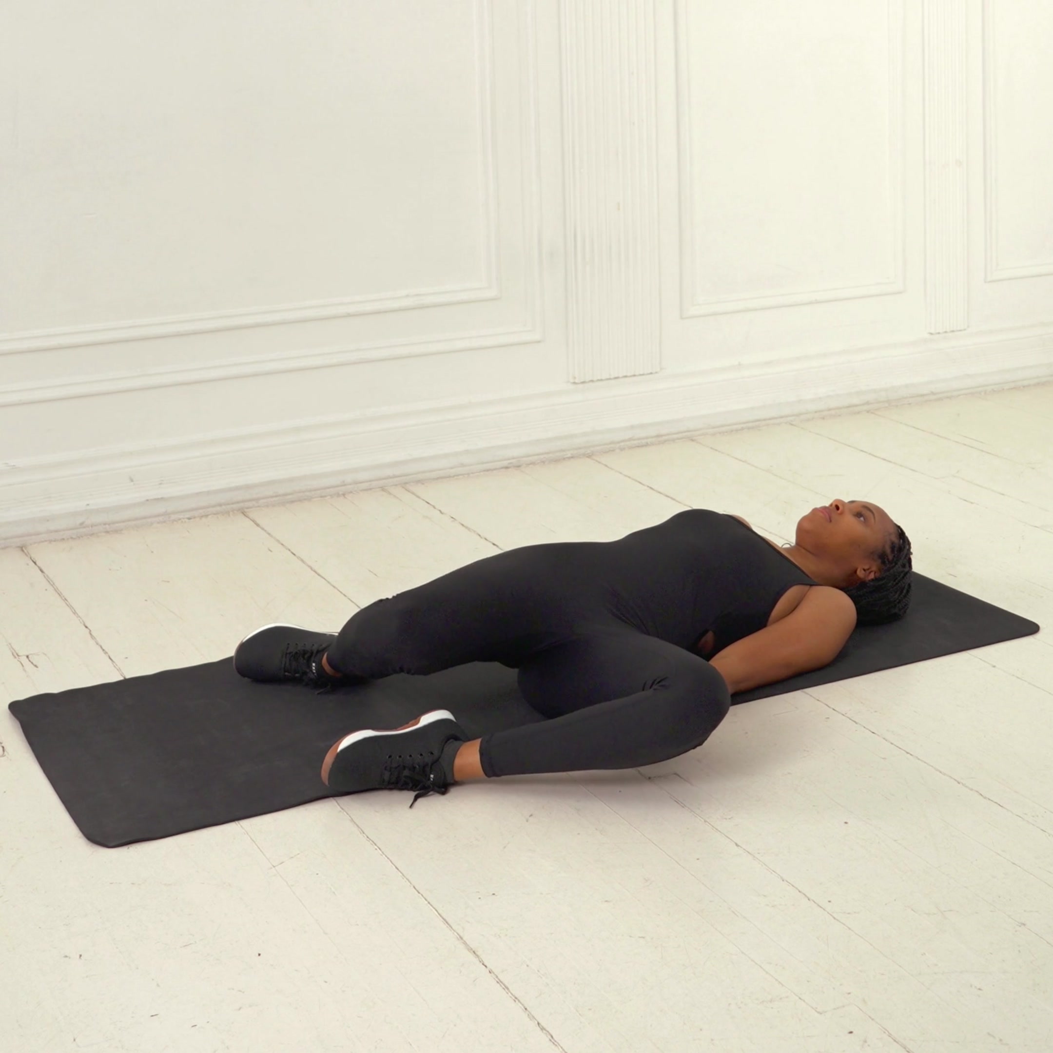 Lower the hips until a deep but comfortable stretch is felt in the gluteal region of the crossed leg.