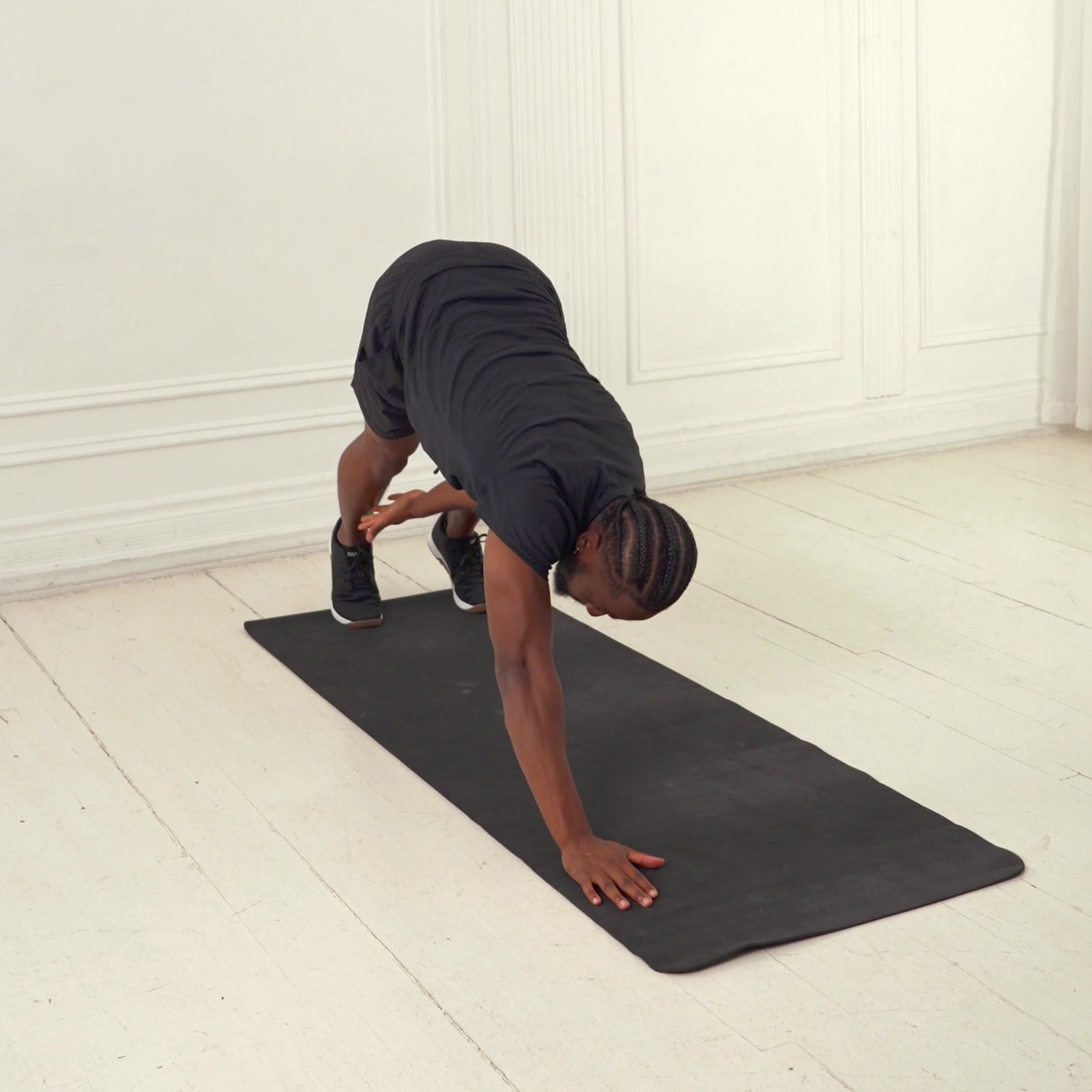 Stand tall with feet hip-width apart and core engaged. Take a step forward with one foot to initiate the walking movement and prepare for the hinge.