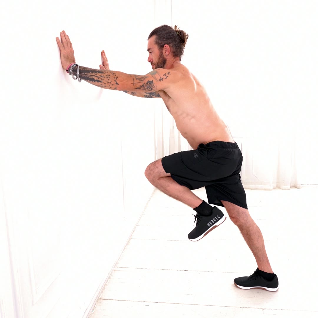 A bodyweight isometric squat hold against a wall that primarily targets the quads, glutes, and core to build lower body endurance and stability; ideal for beginners seeking joint-friendly leg strength.