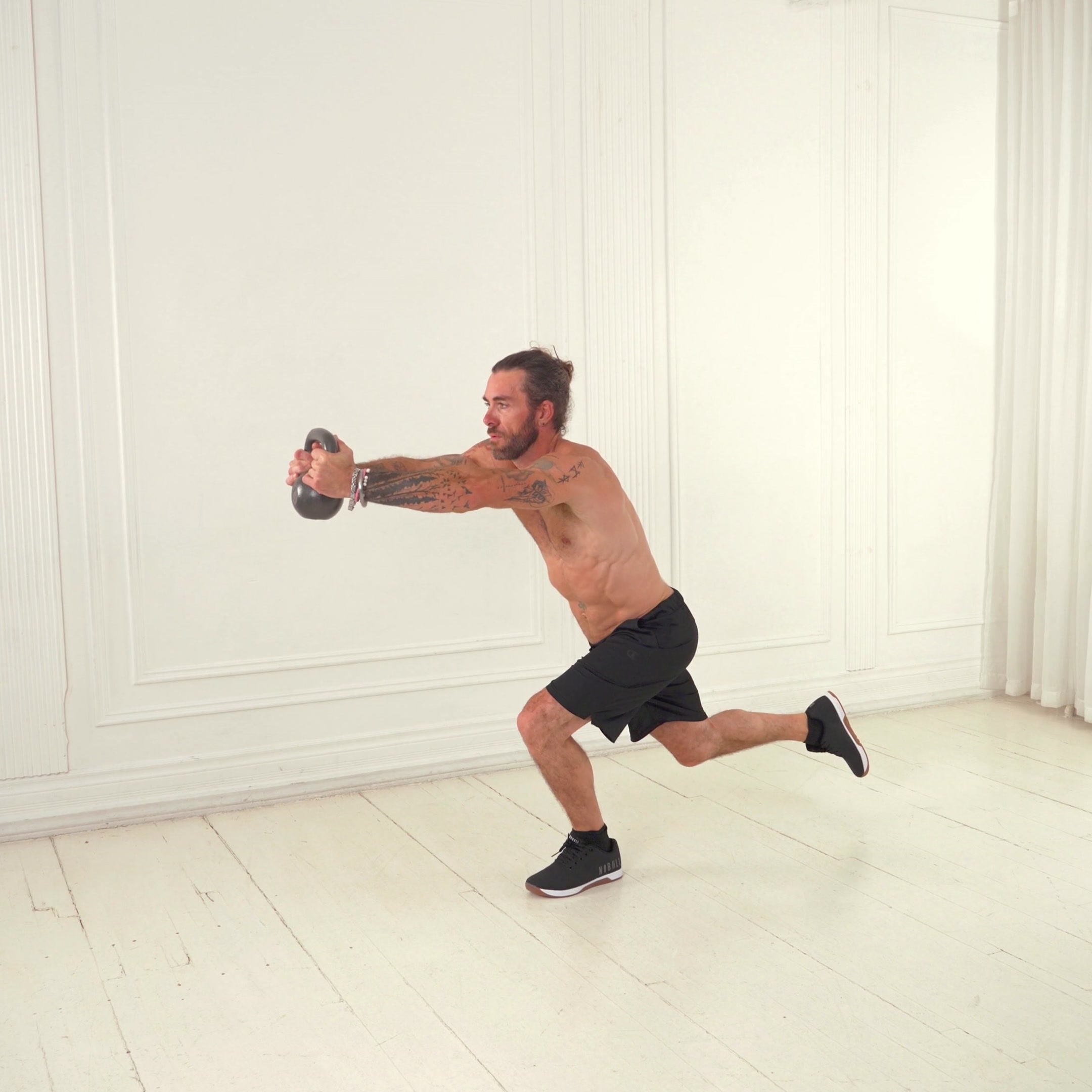 Stand tall with feet hip-width apart, holding a kettlebell goblet-style at your chest. Engage core, extend one leg forward with foot flexed.
