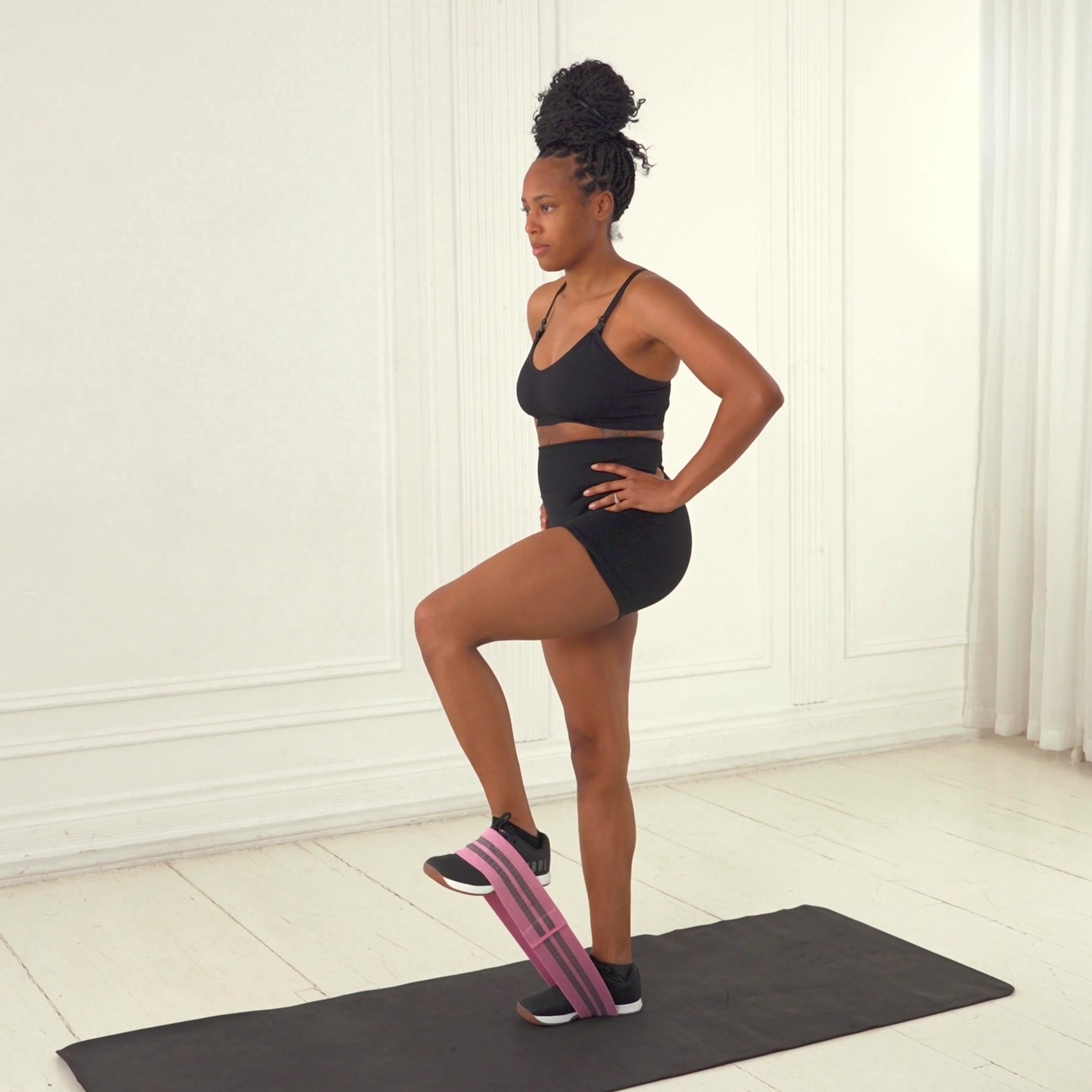 Stand with feet wider than shoulder-width apart, toes pointed forward, hands on hips to start.