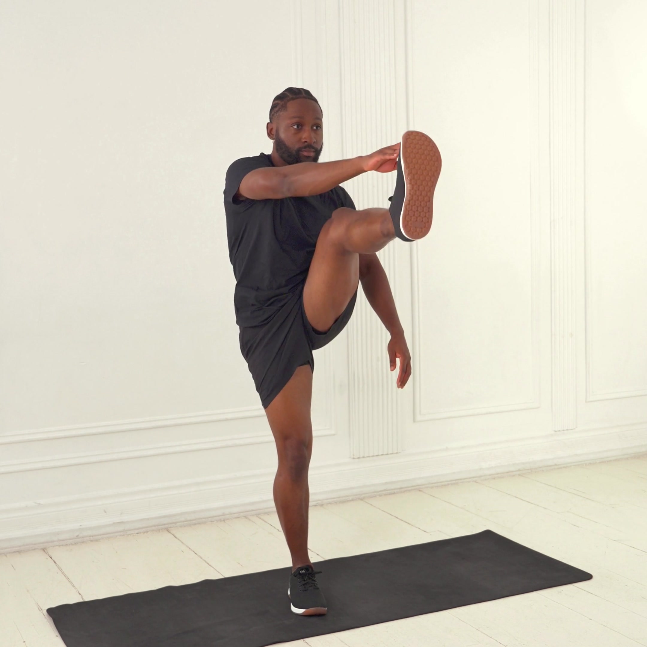 No spotting needed; self-monitor form and use wall for balance if unsteady.
