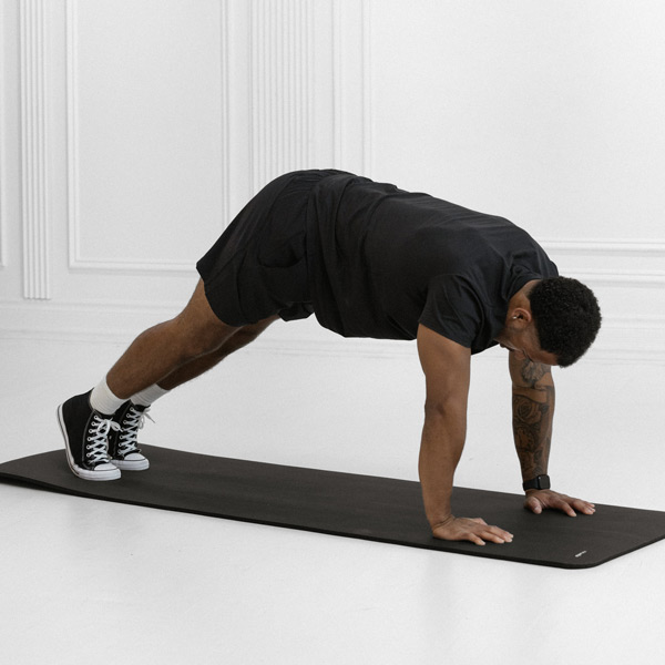 Start in a high plank with hands wider than shoulder-width apart, fingers forward, body straight from head to heels, core engaged.