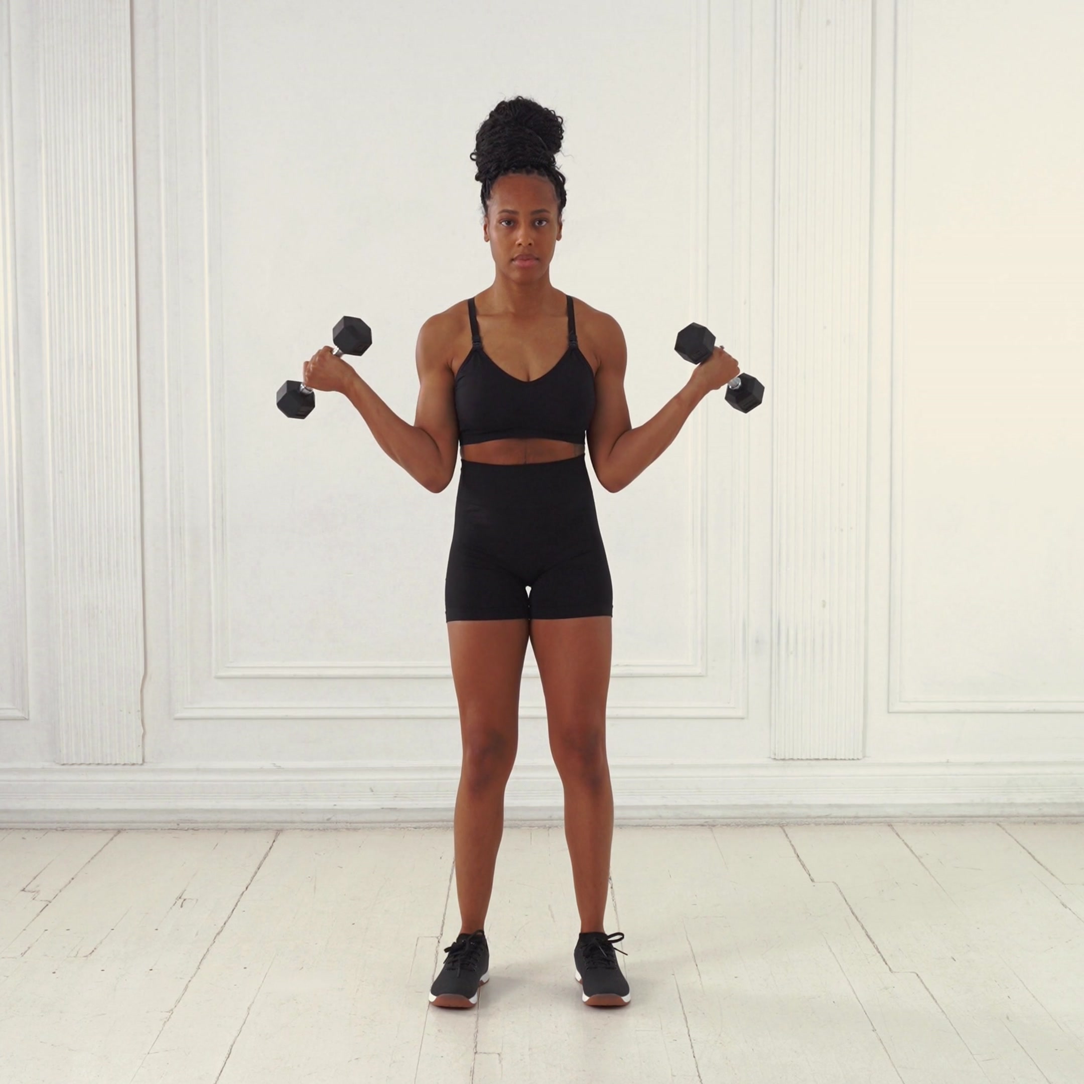 Stand with feet hip-width apart, holding dumbbells at sides with palms facing forward and elbows tucked.