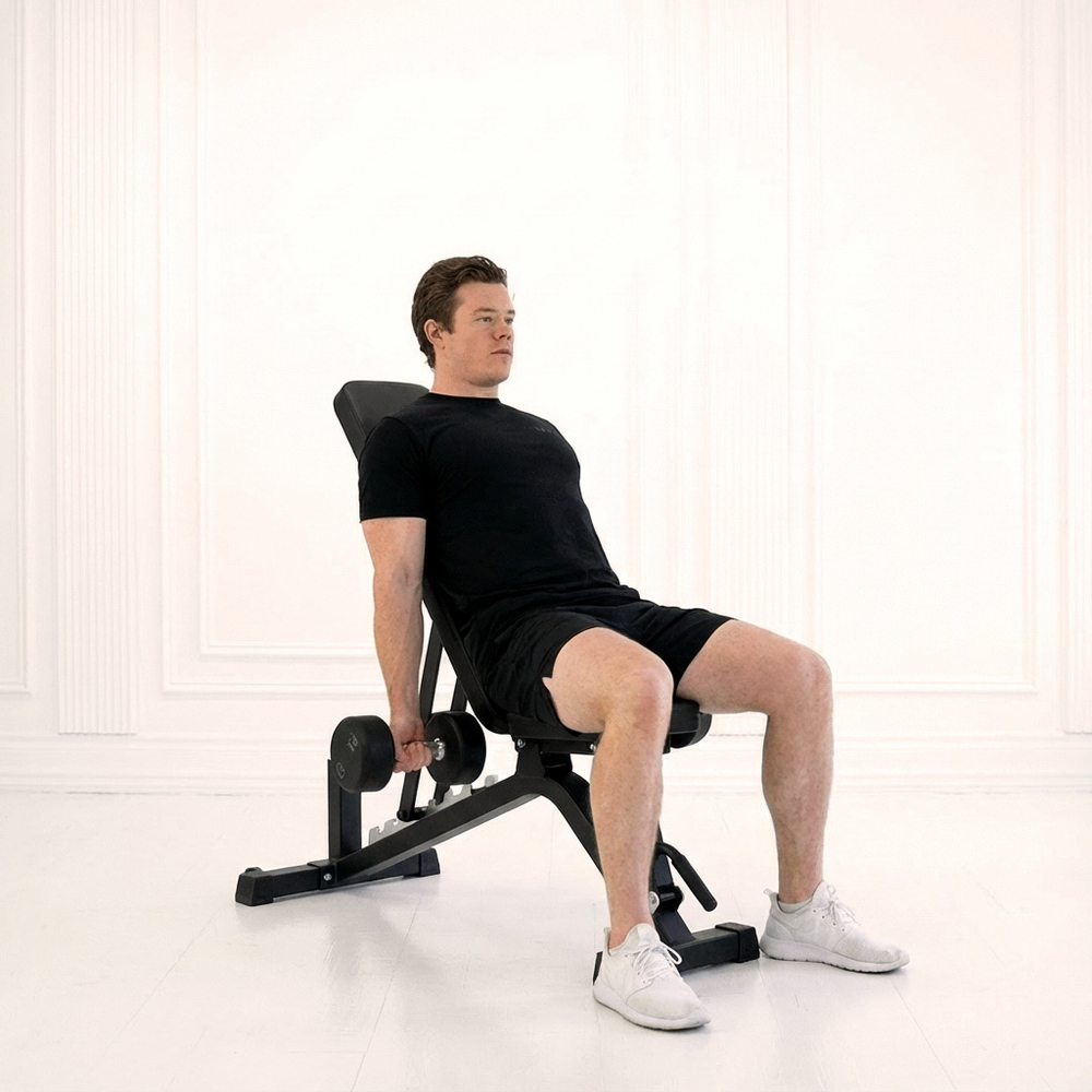 From full arm extension to dumbbells near shoulders, with slow eccentric control.